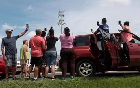 Crowds gather around a mobile network tower to attempt to gain signal after networks were destroyed by hurricanes in 2017 Source: Twitter